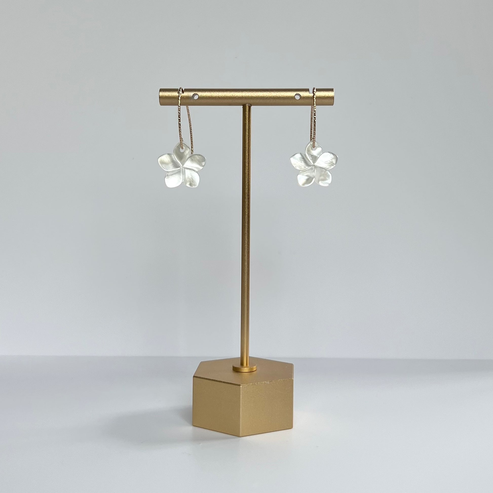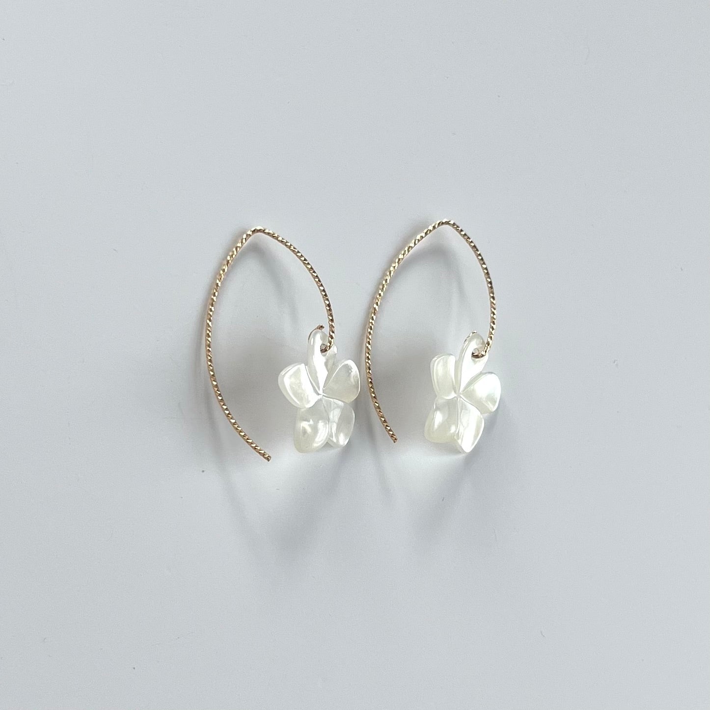 These beautiful earrings feature a large Mother of Pearl flower on a diamond cut v-shaped earring wire- available in both gold filled and sterling silver.