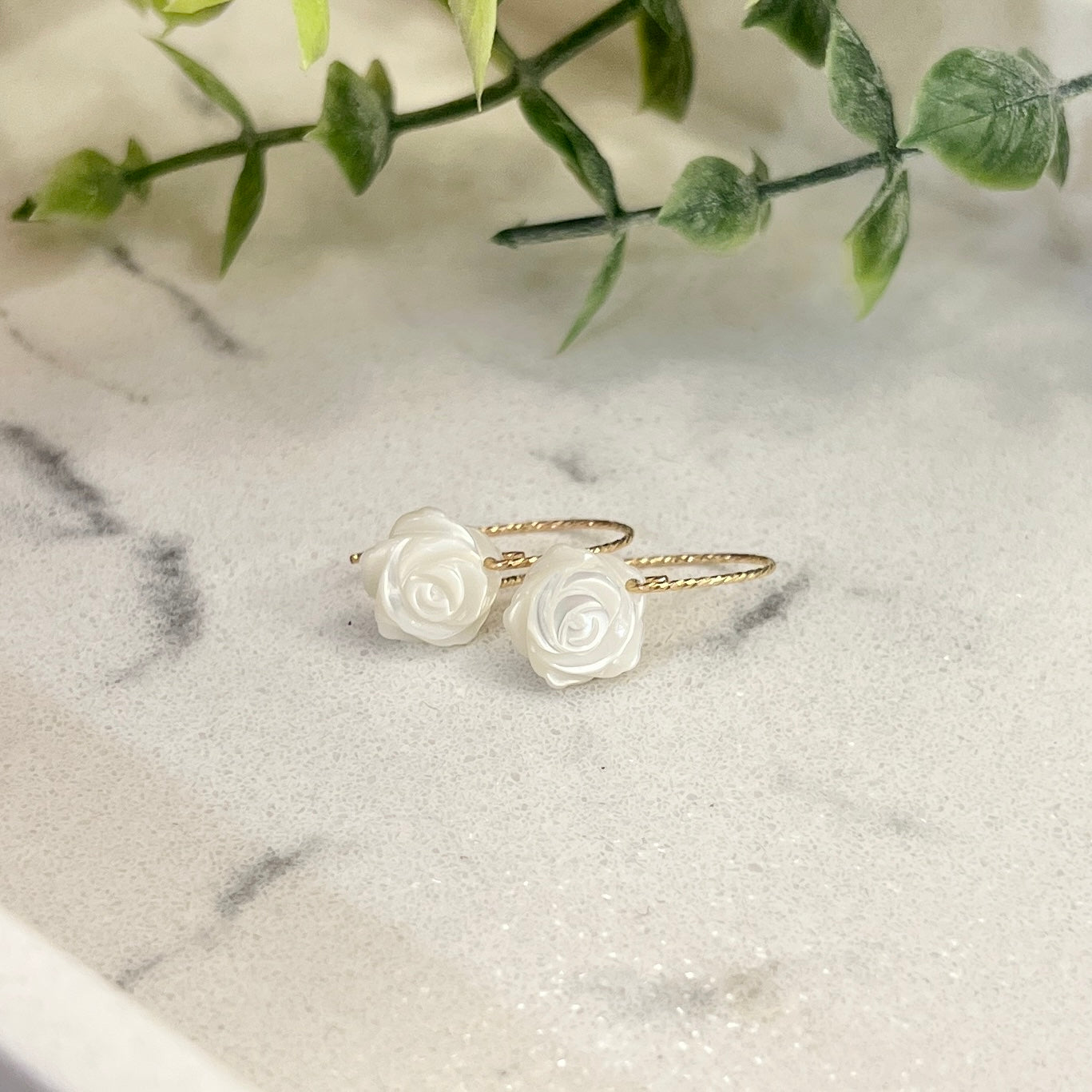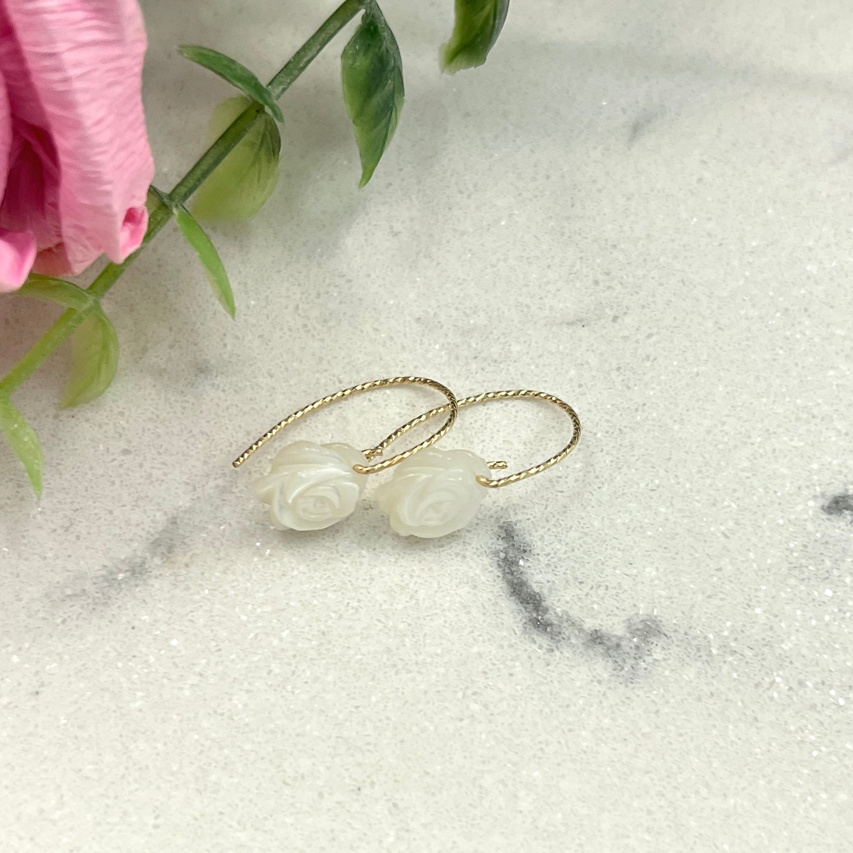 These beautiful earrings feature a petite Mother of Pearl rose flower on a diamond cut gold filled earring wire.