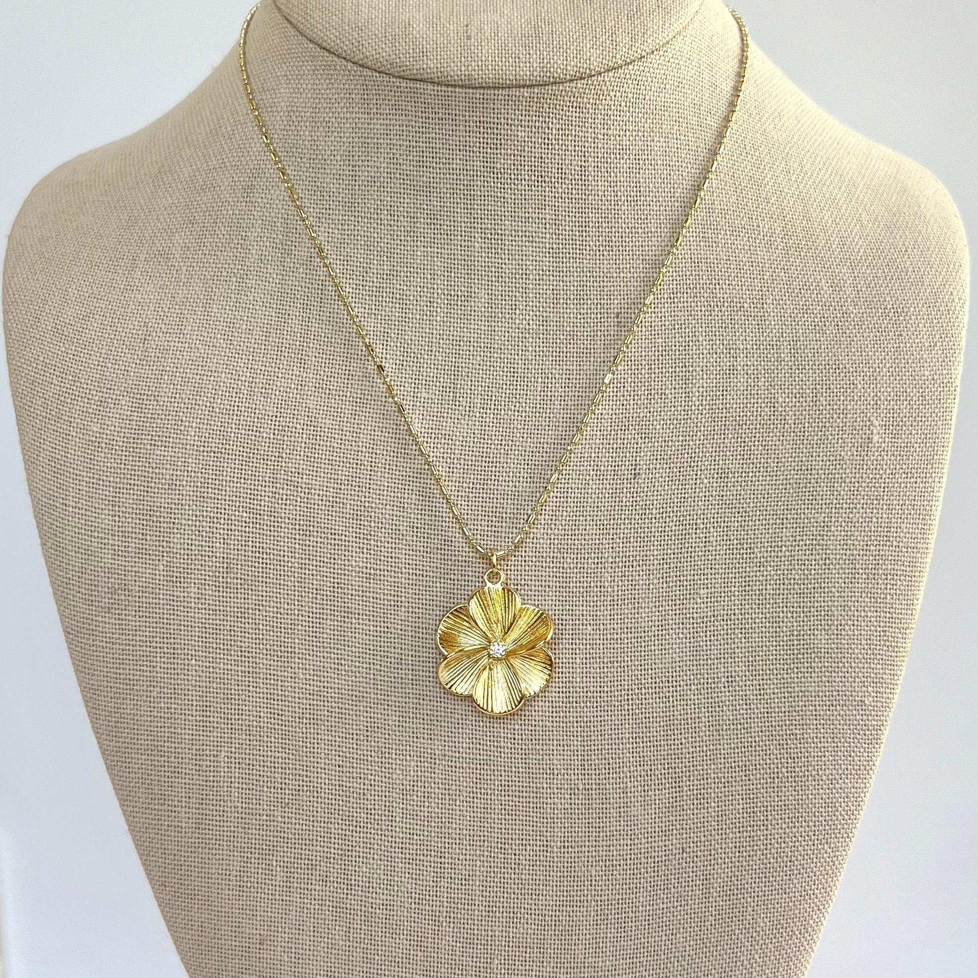 This beautiful necklace features a large gold filled flower pendant on a 16" gold filled ball & bar chain, with 2" extender. Pair it with the matching Judith Earrings for a real show stopper, as Judith was herself!