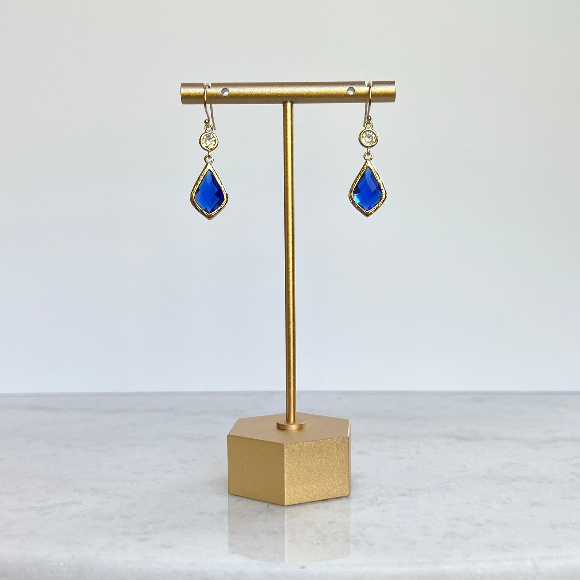 These beautiful earrings feature a dangling CZ stone and diamond shape royal blue pendant hung on a gold filled hook. The colors chosen to mimic the colors seen in the coordinating Our Lady Undoer of Knots Necklace found here.