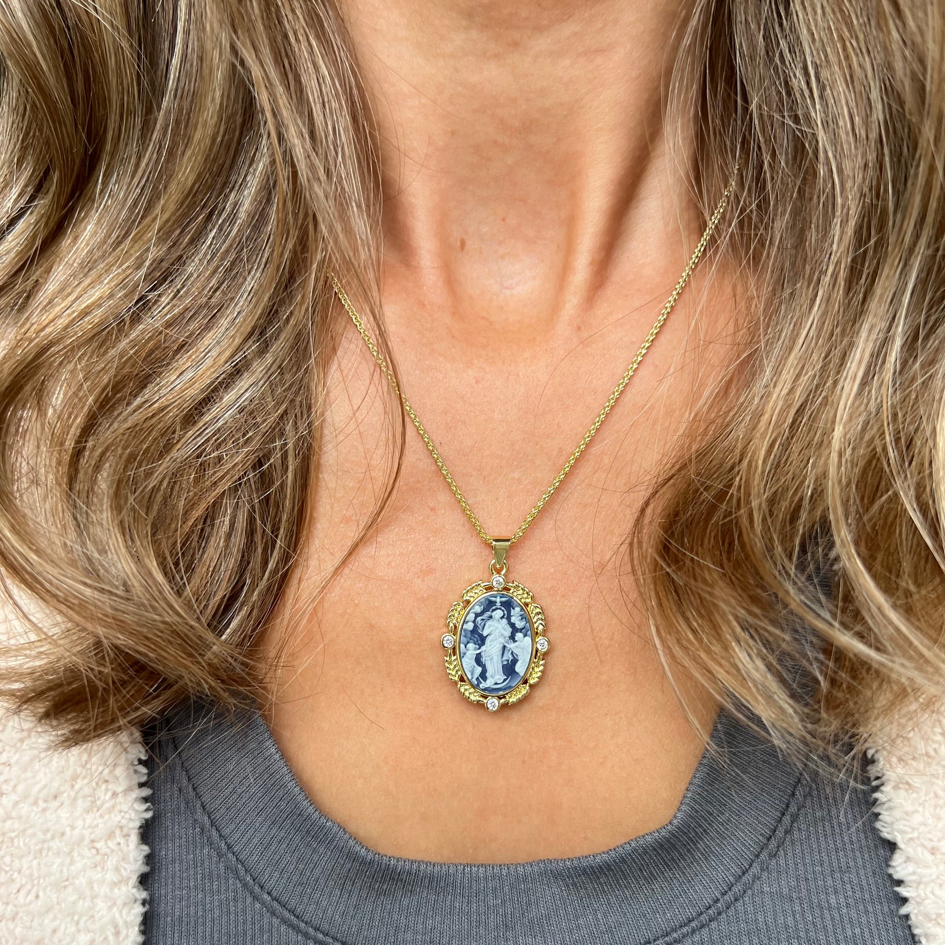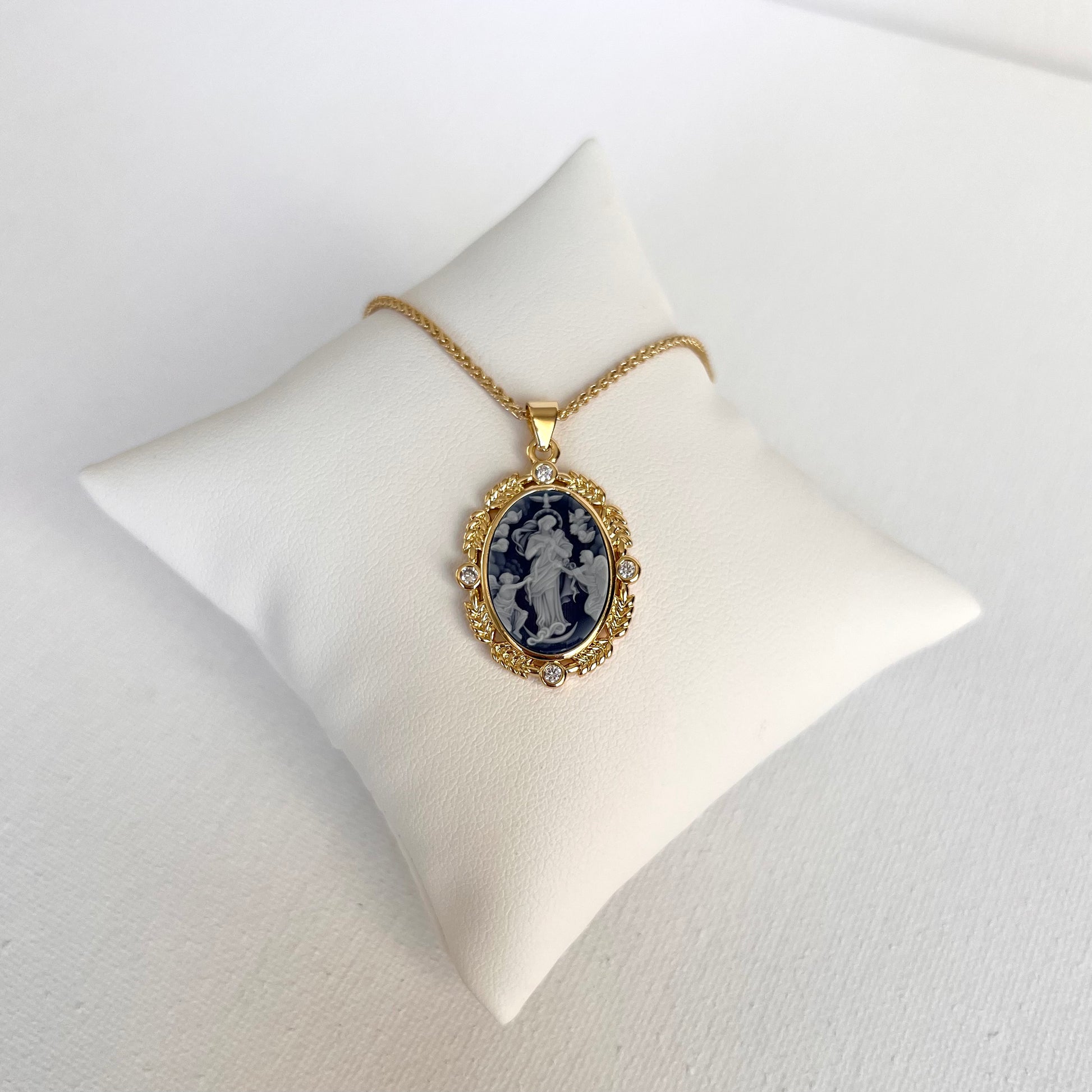 This beautiful necklace features a navy Our Lady Undoer of Knots cameo set in a 24k gold filled pendant, and is held by a 14k gold filled 18” wheat style chain.