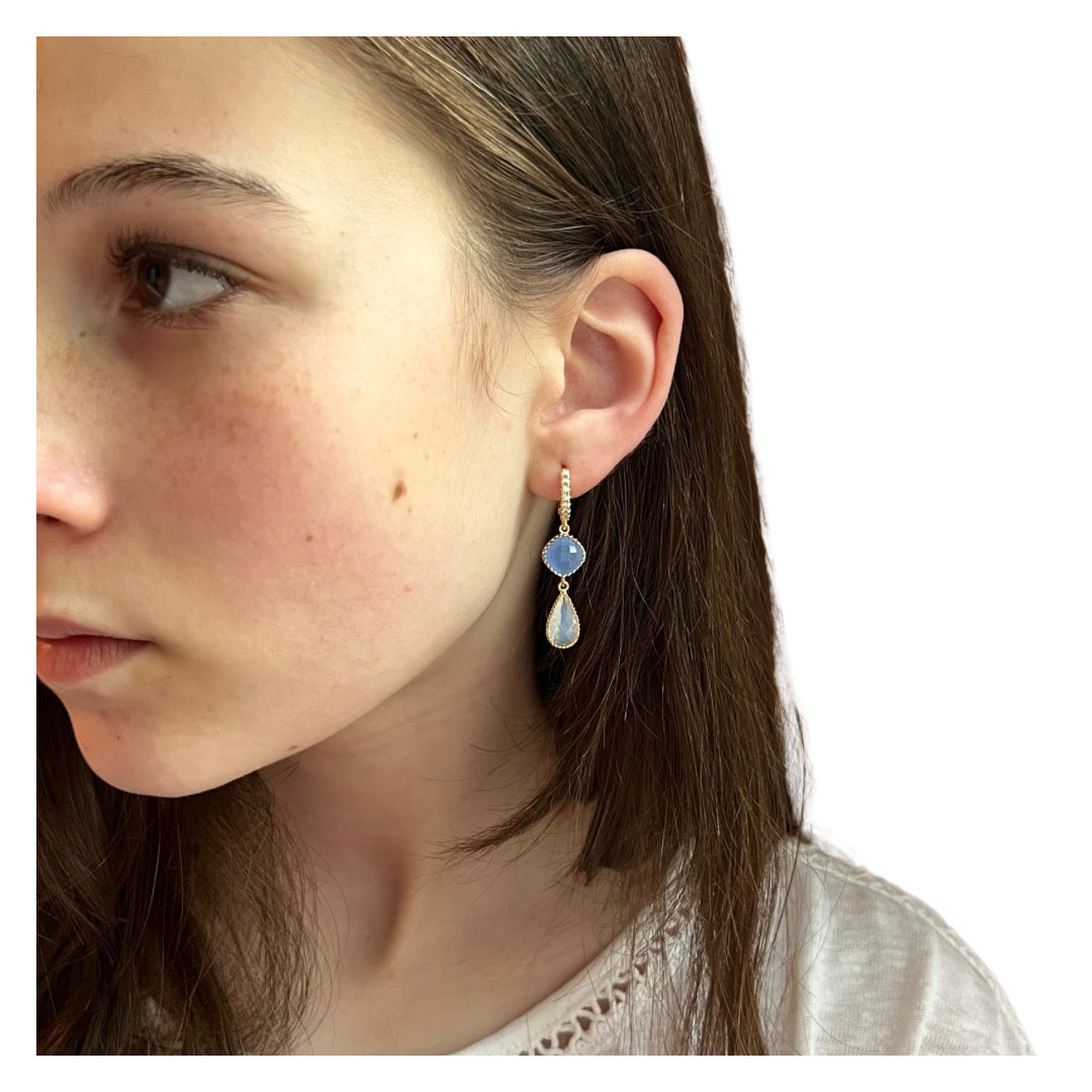 This earring set features a blue glass fancy prong set bezel charm with a milky white glass teardrop shaped prong set bezel hung by a gold filled CZ crested huggie style hoop.