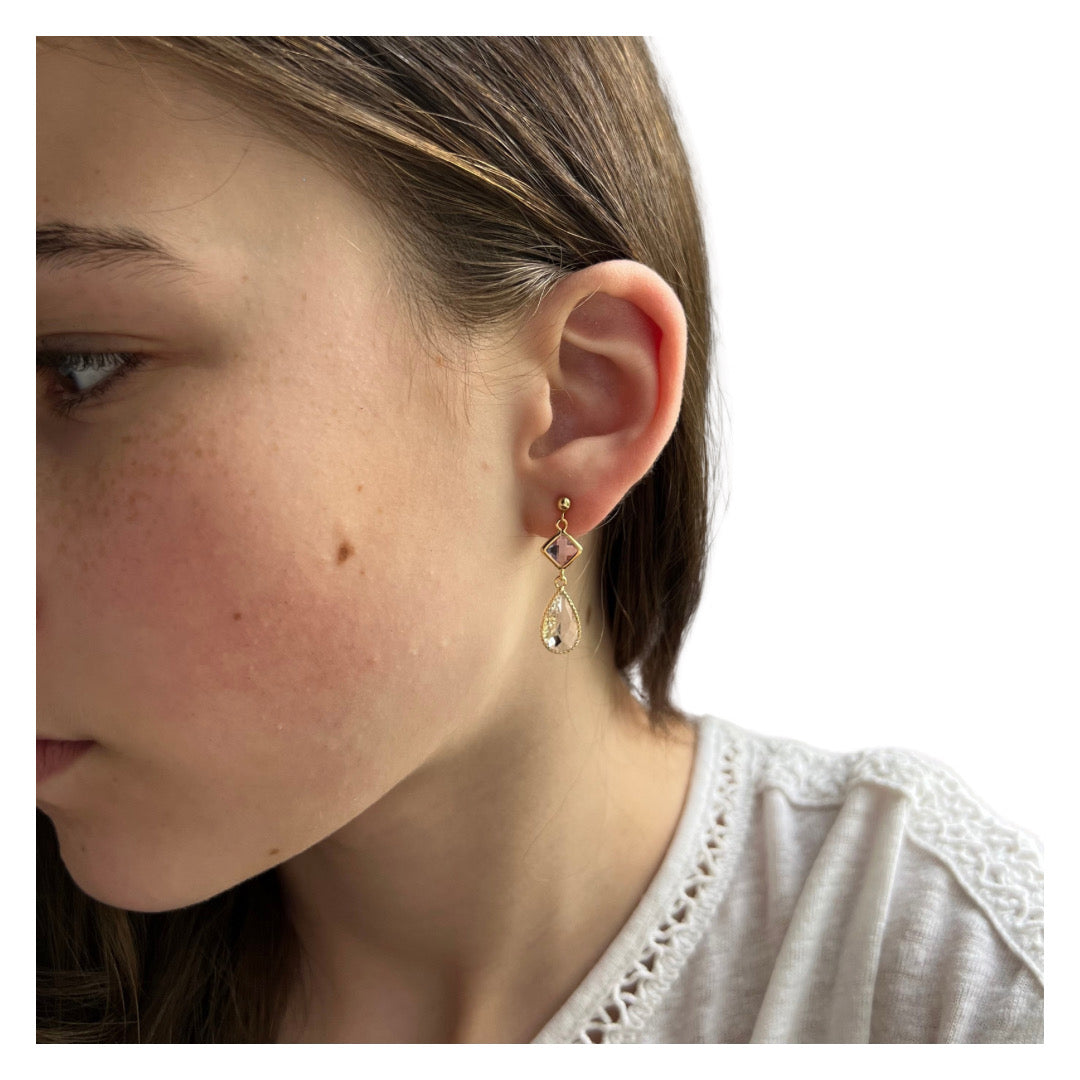 This earring set features a petite pink glass bezel set charm with a clear crystal teardrop shape fancy prong bezel setting hung on a 3mm gold filled earring stud post. Â