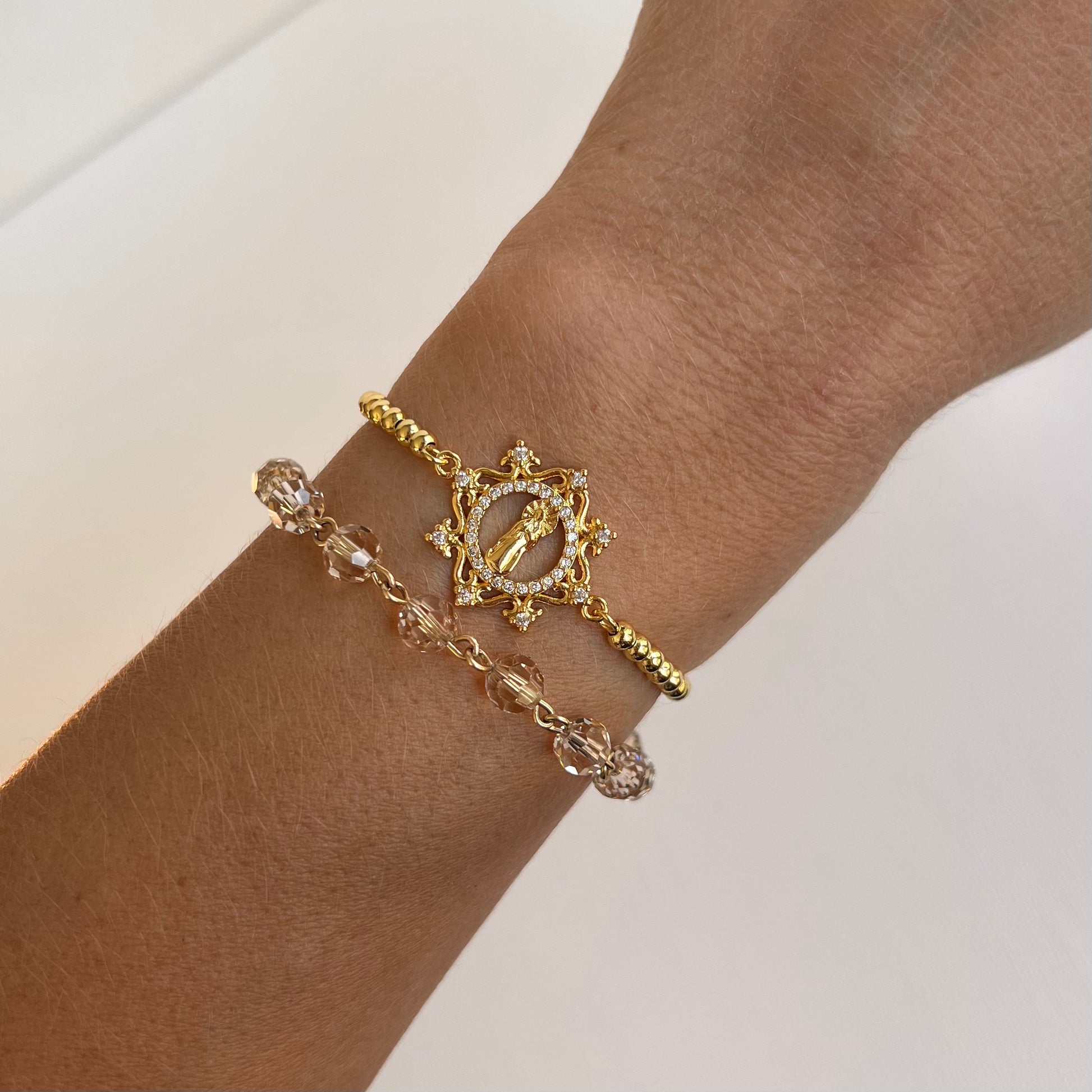 This beautiful dainty bracelet features Our Lady surrounded by a 24k gold filled golden array of cubic zirconia and floral features shining out to the world. The bracelet chain includes 24k gold filled beads and box chain. Fully adjustable.