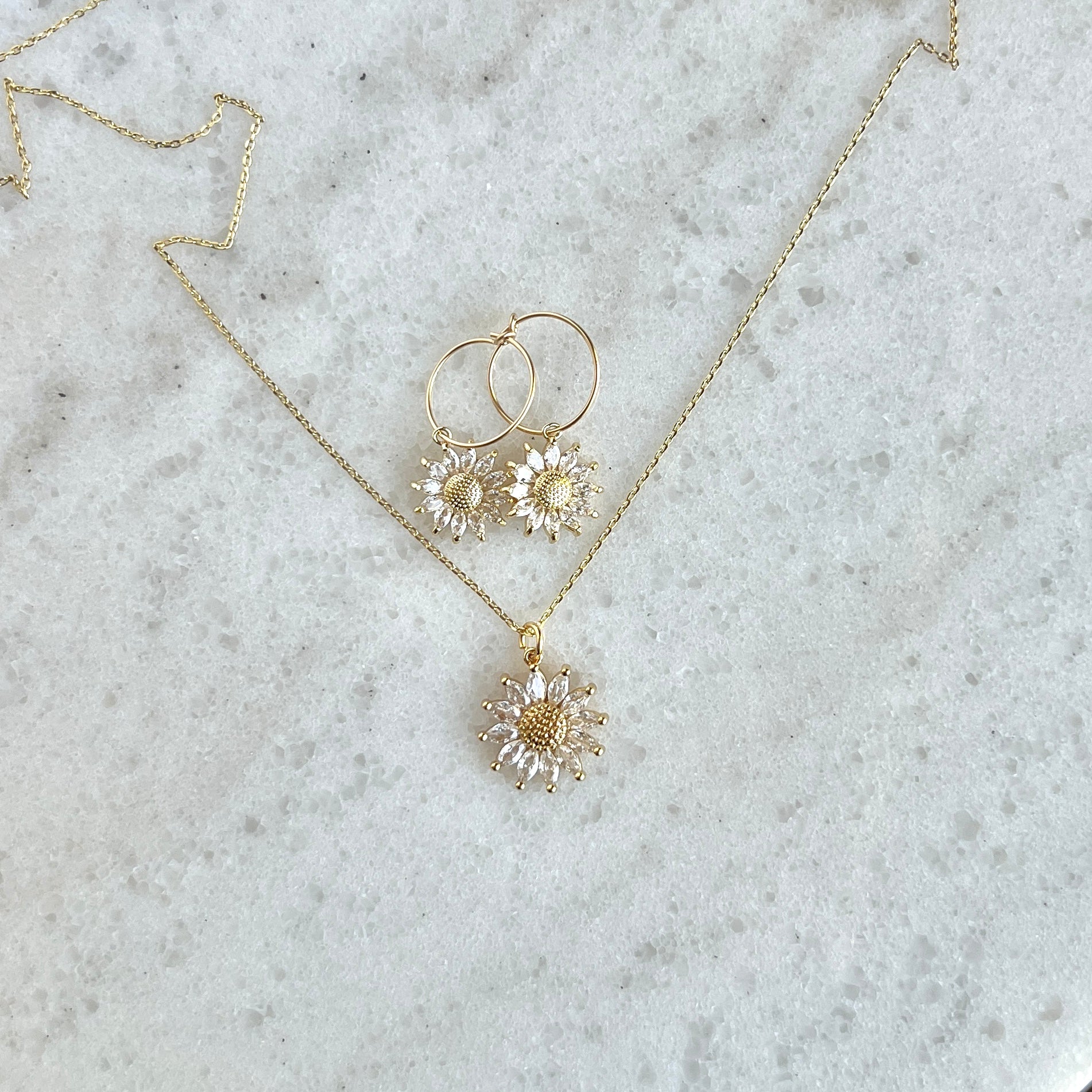 There vibrant earrings feature a beautiful gold filled and CZ arrayed sunflower on a simple 15mm gold filled hoop earring.
