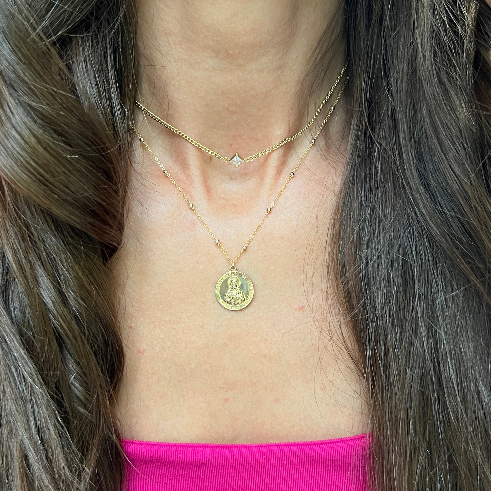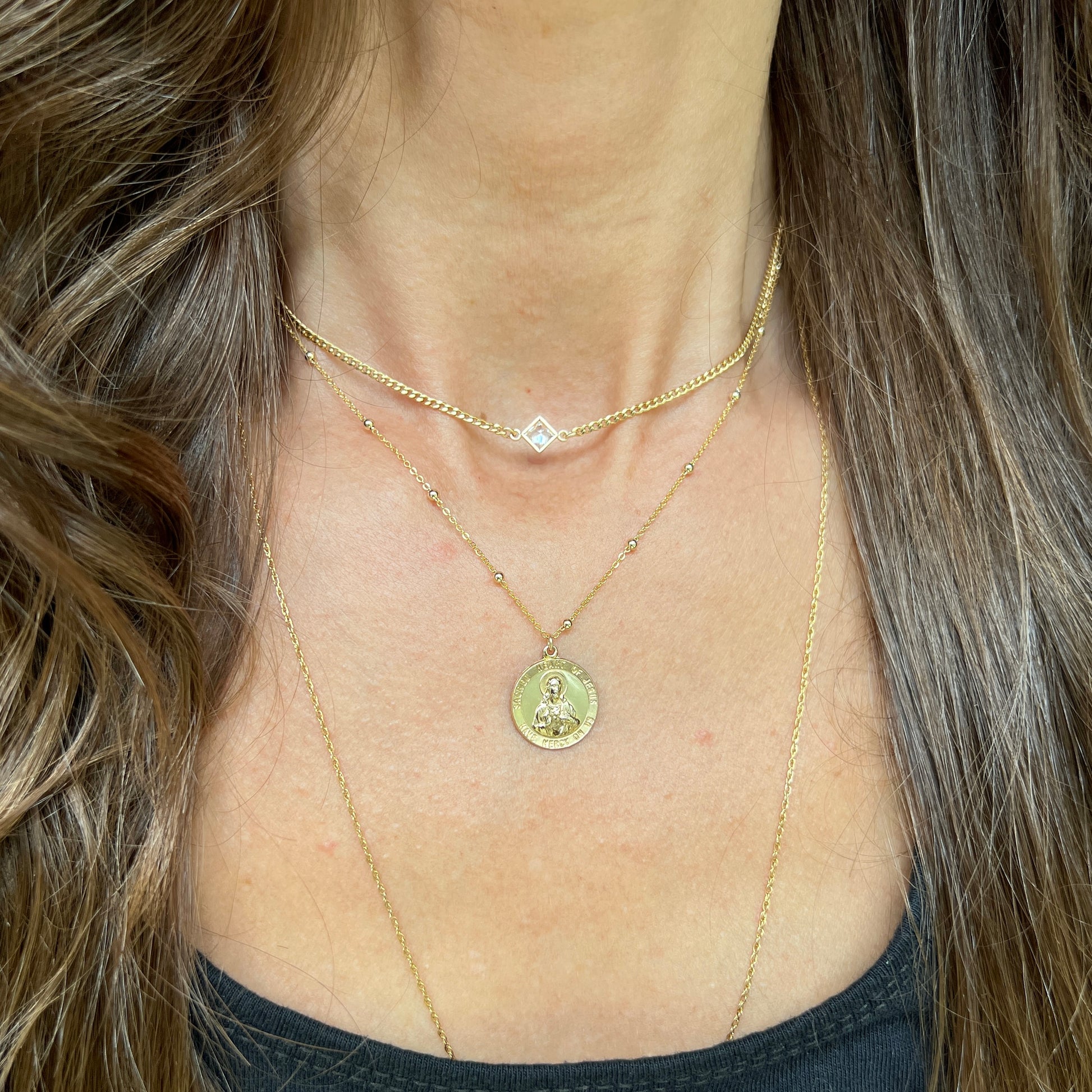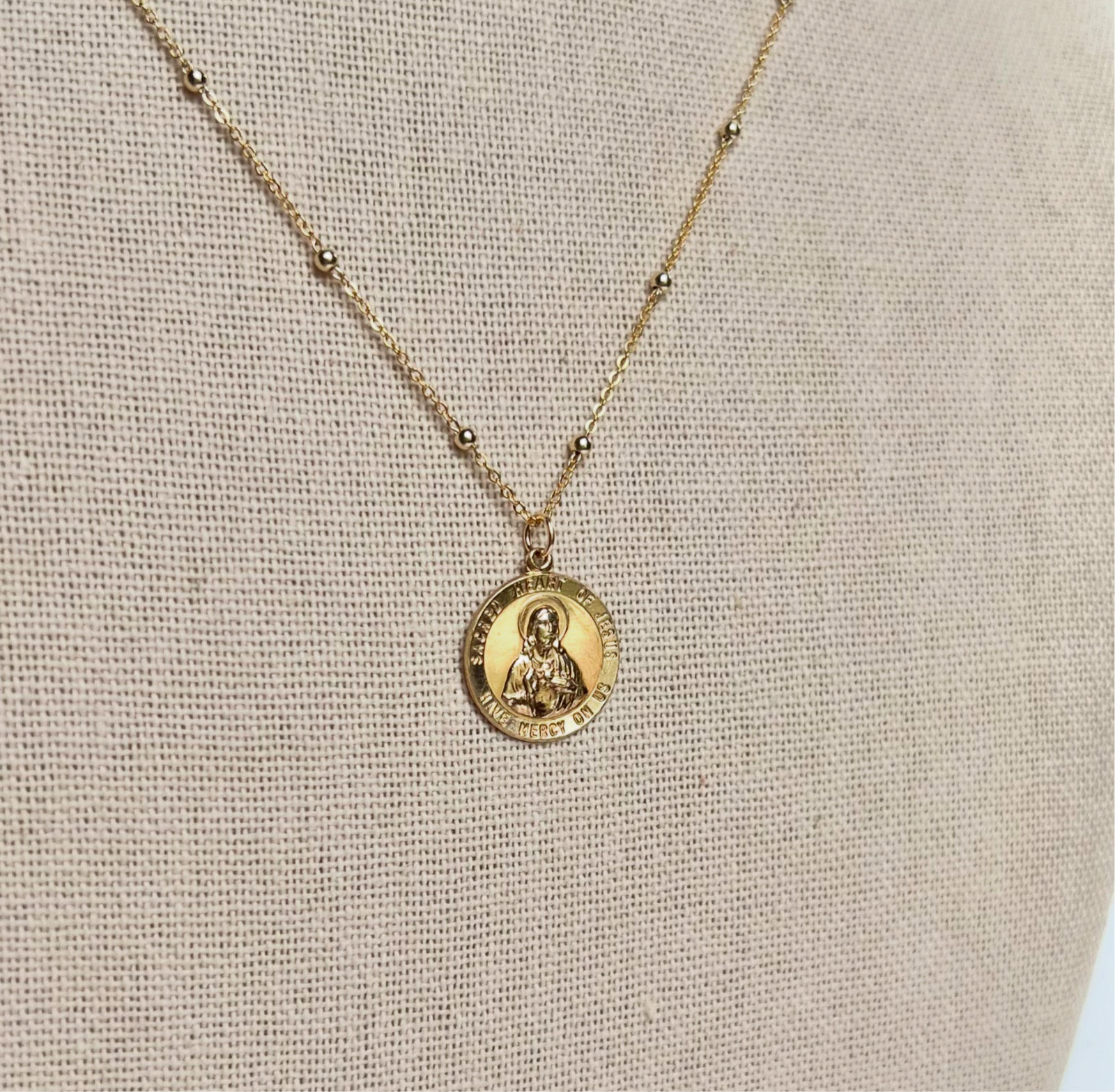 This beautiful and simplistic necklace features a gold filled round pendant image of Our Lord and his Sacred Heart, surrounded with the inscription “Sacred Heart of Jesus, Have Mercy On Us.”