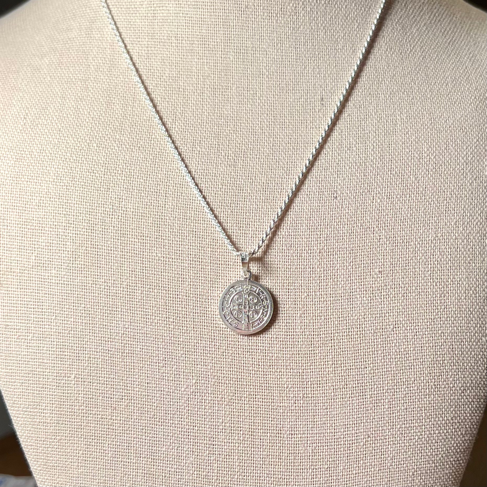 This necklace features a double sided Sterling silver Saint Benedict medal on a 16” Rope style chain (no extender.)