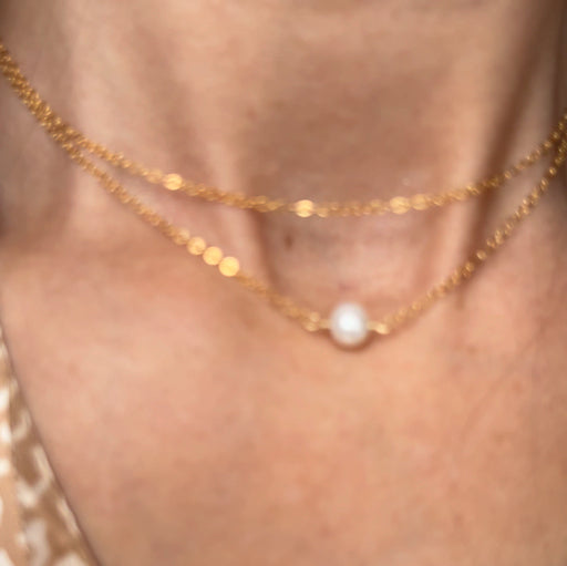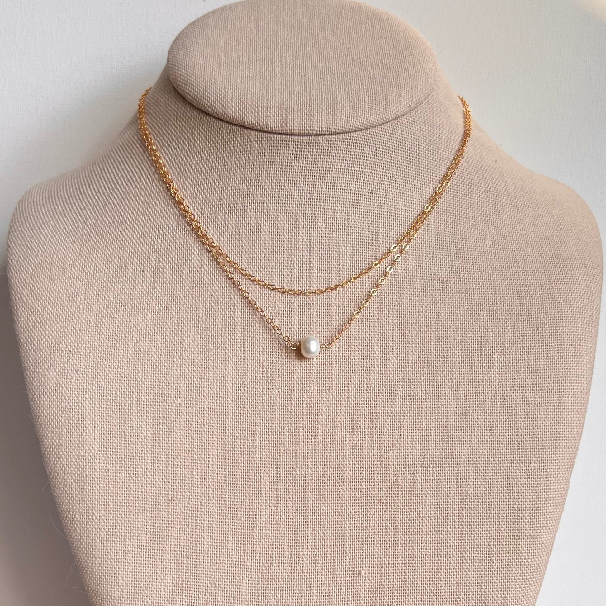 Minimalism at its finest, this minimalist necklace features a single pearl in honor of Saint John the Baptist. The pearl of St. John is resting on a double chain gold filled necklace. The short strand of the necklace measured about 14β, the longer about 15β and the necklace includes a 2β extender.