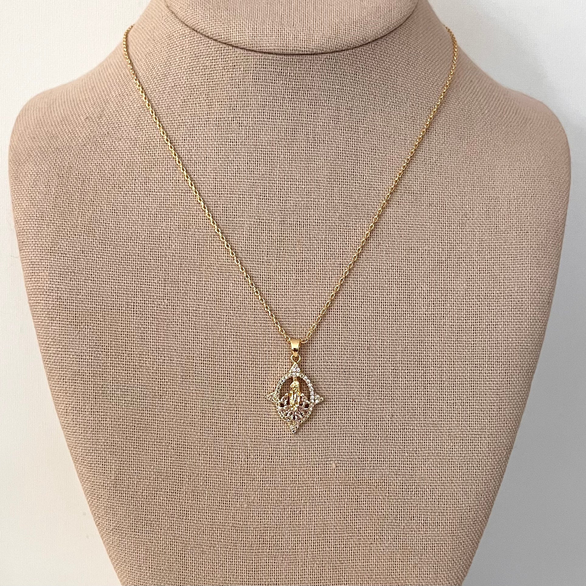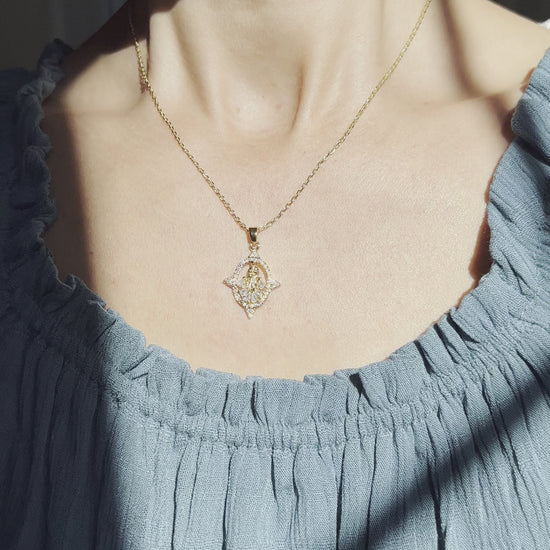 This unique necklace features a gold filled oval Our Lady of Guadalupe pendant in a garden of cubic zirconia held by a 17" gold filled necklace, plus 2" extender.