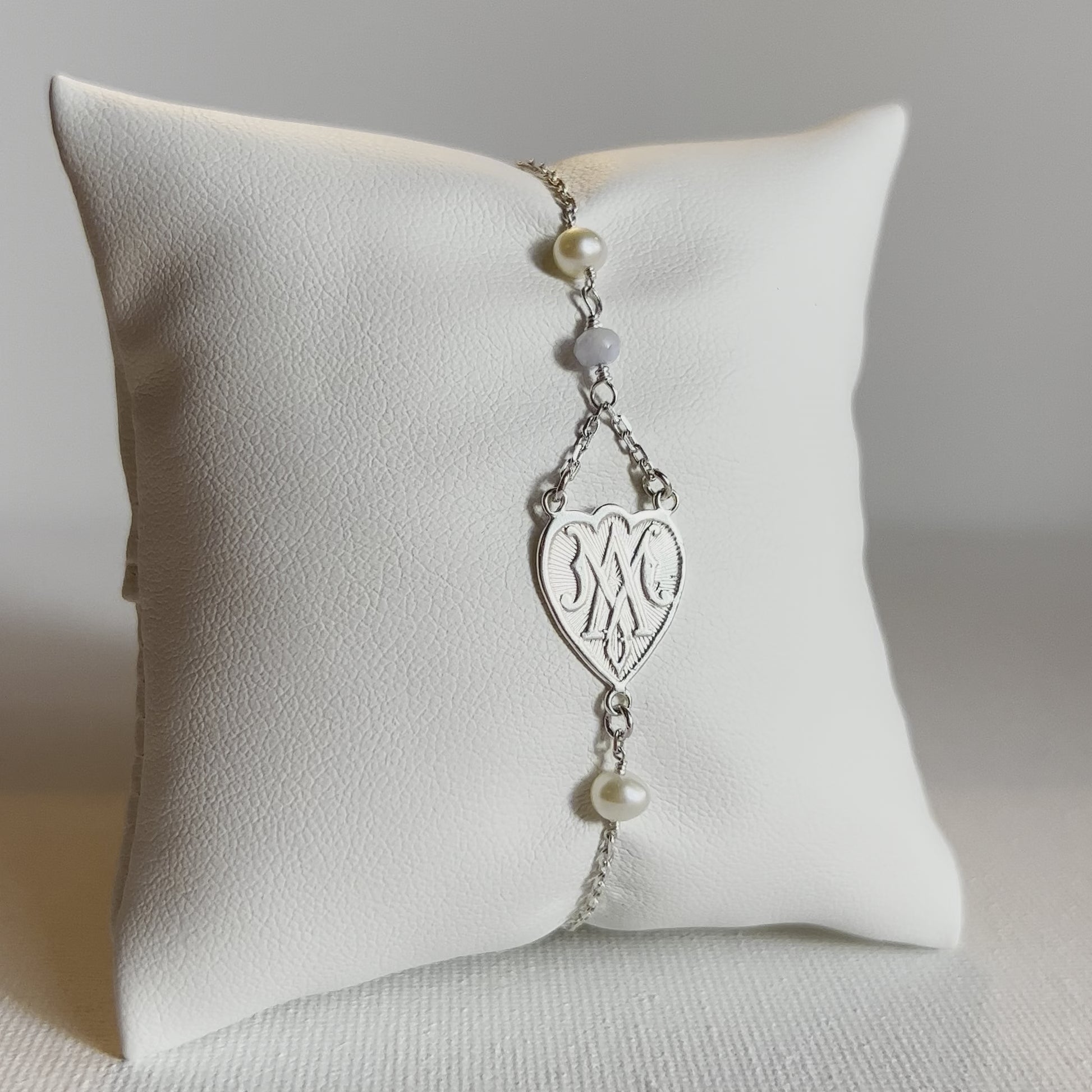 This beautiful sterling silver bracelet features a Marian Auspice center charm with a sterling silver and pearl chain, with one blue bead in honor of Our Lady. This bracelet is entirely made with sterling silver. All sizes include a 1" extension for fit preference.Β